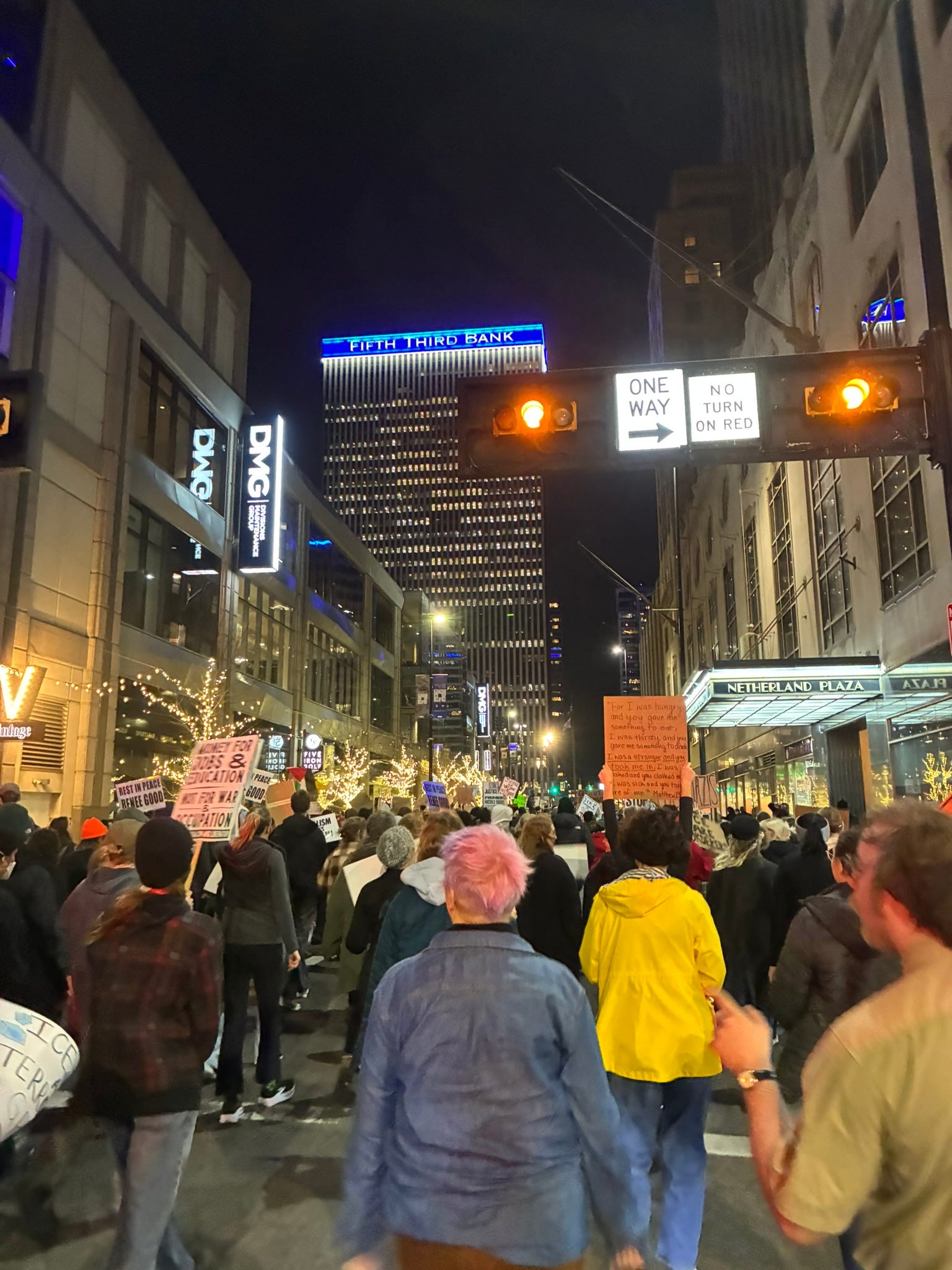 I’ve been to two protests in downtown Cincinnati this month, one just after Renée Good’s murder and one last night. Both times, I expected a small group, and both times, a huge crowd greeted me, a crowd that only grew as we started marching through the city, chanting and singing and calling for justice. It felt electric, energizing, so good to be out there in community marching. Protests are only one small symbolic piece of a much larger puzzle, but still, it’s action. It’s not sitting in my house hemming and hawing about whether to start prepping or get plans in place to move abroad or spiraling into general doom. It’s being outside, it’s being together, it’s showing up.