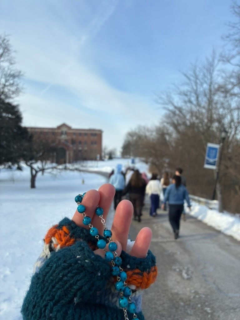 One of the most meaningful moments of my teaching career happened yesterday. One of my coworkers led a group of students in saying the rosary while walking around the school, in solidarity with the nationwide General Strike. Teachers can’t exactly strike or talk about our political opinions, but there is one thing we can do at a religious school: pray. It was optional; we didn’t tell any of the students that they had to join us. We just said we had to speak out against the state-sanctioned violence that directly counters all the teachings of the Church on respect for life. Neither of us really expected any students to join, but there was a big group. They had organized amongst themselves, distributing rosaries and making a plan to walk. We circled the building, cycling through the Decades and the Sorrowful Mysteries and the Glory Be. As it was in the beginning, is now, and ever shall be, world without end. Amen. It was a risky move in our environment. We’ll see what consequences await. But action should involve risk. If it doesn’t, it isn’t action.